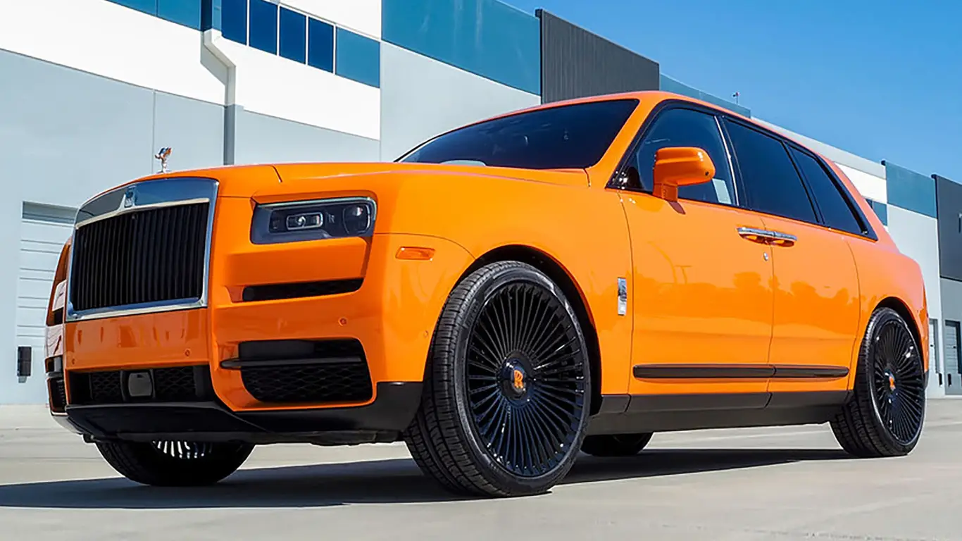 В сети набирает популярность необычный Rolls-Royce Cullinan в ярко-оранжевом цвете с массивными 24-дюймовыми дисками Forgiato. Контрастная чёрно-оранжевая отделка сделала его похожим на «тыкву» из мира роскоши — смелый, эффектный и идеально осенний образ.